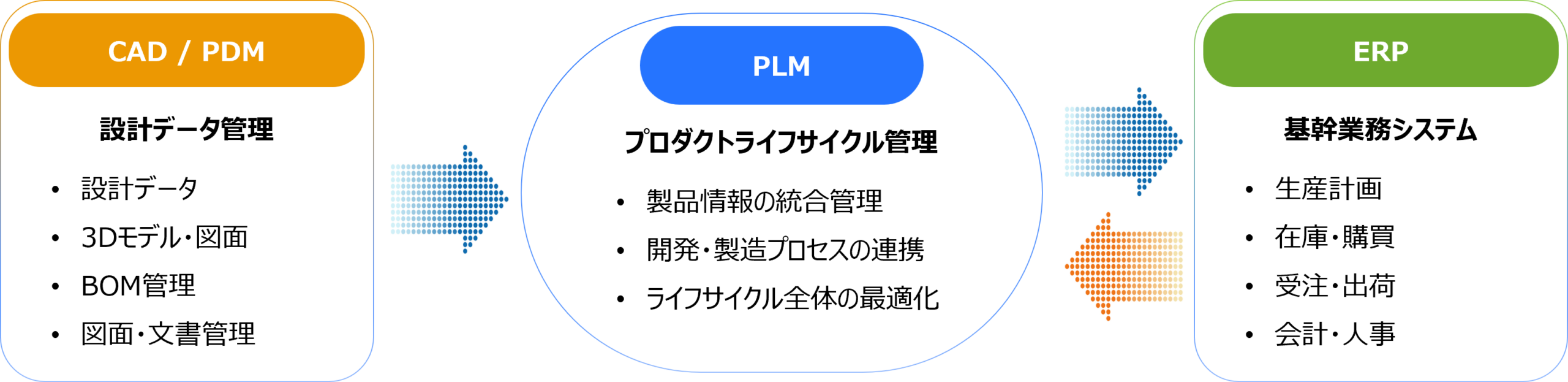設計で決まった情報をそのままERPに渡すのではなく、設計意図を保ちながら、生産可能な形へと展開・整合させる。この橋渡し領域こそがPLMのポジションです。E-BOMとM-BOMの差異を管理しながら、部門間の情報断絶を防ぐ役割を果たします。